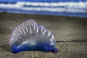 The man-of-war sting is agonizingly painful but rarely deadly. Even though they are washed up on shore they can still sting for up to a week. Severe stings can trigger chest pain, difficulty breathing even death. More commonly, they cause pain for 20-40 minutes and welts. They can be especially dangerous to those who are allergic, which are people who also suffer from bee sting allergies.